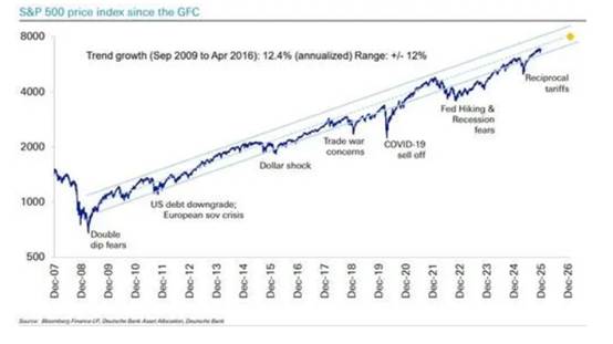 若2026年美股再次上涨,将是自全球金融危机以来首次连续四年上涨,其长期走势依然在2008年金融危机后形成的稳定增长轨道内。