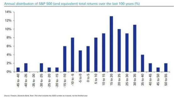 在该行的乐观预测中,标普500指数可能在2026年达到8000点,意味着约17%的年度回报。从历史数据看,15%至20%的年回报率在过去一个世纪中最为常见,且有近40%的年份涨幅更高。