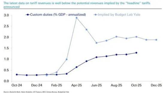 德意志银行指出,目前实际征收的关税收入远低于名义税率暗示的水平,这表明政策“雷声大雨点小”。