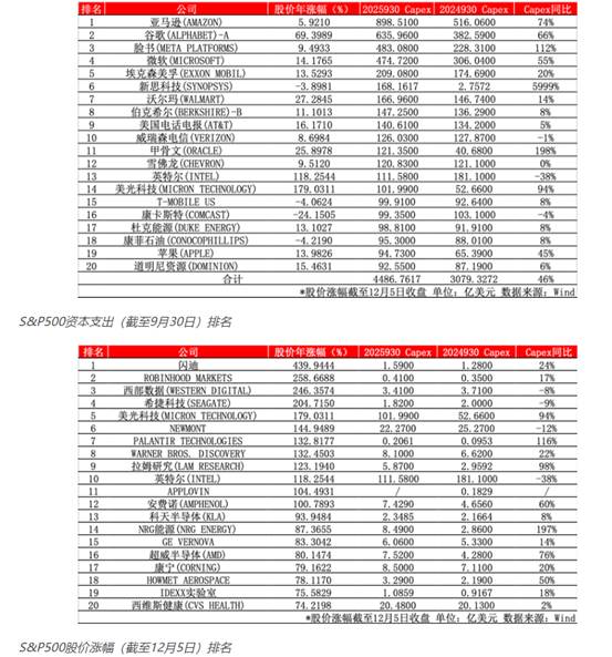 同时出现在资本支出涨幅和股价涨幅前20的S&P500公司仅有两家:美光和英特尔。