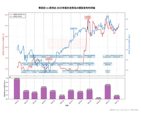 8月-12月初,英伟达的市值一度突破5万亿美元,但市场对于AI投资“泡沫”的担忧也越来越甚,英伟达的股价也在这一阶段呈明显的震荡趋势。而寒武纪在8月份(单月)股价大幅上涨,9月份开启了震荡模式。