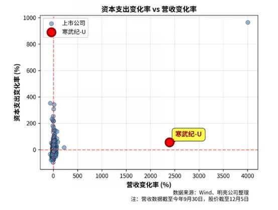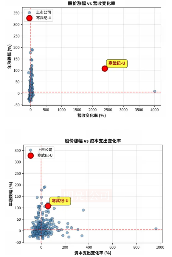 再对比寒武纪与沪深300其他公司,其股价涨幅和资本支出变化基本上没有相关关系。相比其他公司,寒武纪的最大差异化是其营收增速的大幅改善。这或许是市场能够在今年达成的核心共识。