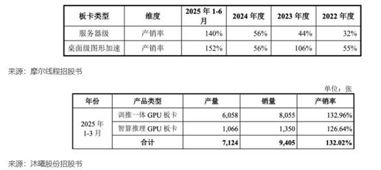 据摩尔线程和沐曦股份的招股书,两家公司在2025年开始产销率均已超过100%,且明显好于2024年,反映出两家公司开始进入商业化加速阶段。