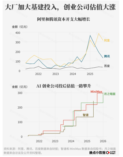 最大的投入来自那几家公司。钱是它们最不缺的资源。字节跳动一年就消耗掉了 1500 亿元;阿里喊出了三年 3800 亿元的口号;一向谨慎的腾讯也愿意在一个季度内花 400 亿元买 GPU、建算力中心——相当于此前腾讯两年的资本开支。