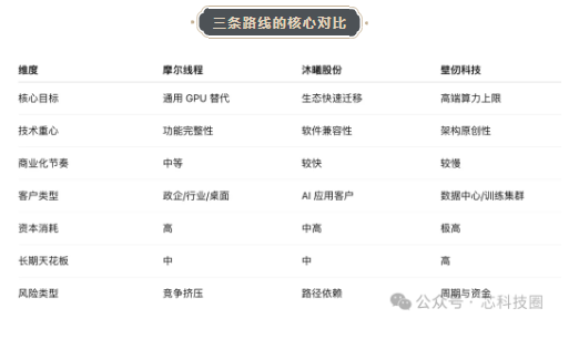 相反,当前主流国产 GPU 创业公司,已经在以下三个方向上发生了清晰分化:
