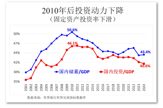 自2010年以来,中国的劳动年龄人口与非劳动年龄人口的比例逐年下降。人口老龄化带来的不仅是劳动力短缺,更是储蓄率和投资率的下降。如下图所示,中国的储蓄率从2010年的50.6%下降到了2024年的43.4%,同期投资率从46.1%降至40.6%。