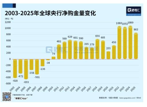 而且注意啊,不是中国一家央行在这么干,很多央行都在囤黄金。2022-2024年,全球央行净购金量连续三年超过1000吨,这超过了当年黄金产量的三分之一。即使2025年有所下降,跌至865吨,但仍是2018-2022年这5年平均数值469吨的约2倍。