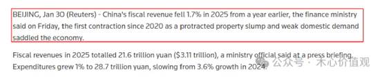2026年1月全国财政收入同比下降1.7%,这是自2020年以来的首次萎缩。