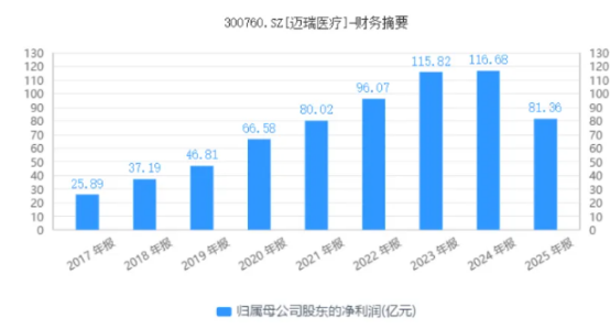 前不久,国内“医疗器械一哥”迈瑞医疗公布2025年年报。数据显示,2025年全年,迈瑞医疗营收332.82亿元,同比下滑9.38%;实现归母净利润81.36亿元,同比下跌30.28%。这也是迈瑞医疗自2018年上市以来,首次出现营收、净利润双双下滑的情形。从拉长周期来看,迈瑞医疗2025年净利润水平几乎是与2021年同期相当,几乎是一夜回到五年前。