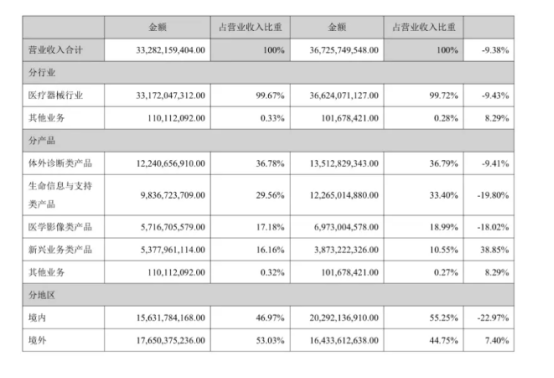 分区域来看,迈瑞医疗国内业务实现收入156.32亿元,同比下降22.97%,成为公司营收下滑的主要因素。对比看,迈瑞医疗国际业务实现收入176.50亿元,同比增长7.40%,营收增速较往年也明显放缓。