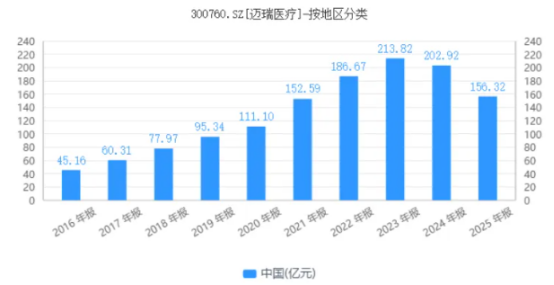 从拉长周期来看,迈瑞医疗国内营收已经连续三年出现同比负增长。数据显示,2023年-2025年,迈瑞医疗国内市场销售收入分别为213.82亿元、202.02亿元和156.32亿元,三年期间营收规模缩水57.5亿元。