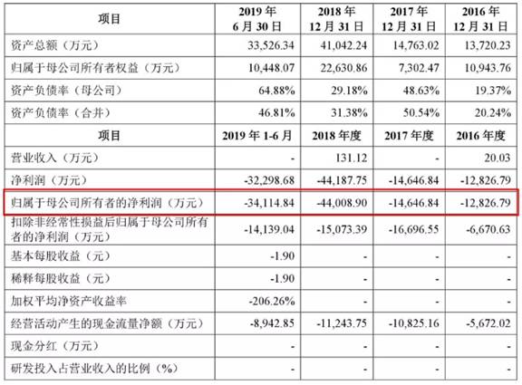 截至本招股说明书签署日,公司所有产品均处于研发阶段,尚未开展商业化生产销售,公司产品尚未实现销售收入,公司尚未盈利且存在累计未弥补亏损。2016年度、2017年度、2018年度及2019年1-6月,公司归属于母公司普通股股东的净利润分别为-12,826.79万元、-14,646.84万元、-44,008.90万元和-34,114.84万元,三年半合计亏损超10.5亿元。