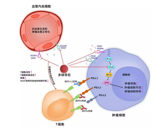 多纳非尼通过抑制血管内皮生长因子受体(VEGFR)和血小板源性生长因子受体(PDGFR)等多种酪氨酸激酶受体的活性,阻断肿瘤血管生成,又可通过阻断丝氨酸-苏氨酸激酶(Ras/Raf/MEK/ERK)信号传导通路直接抑制肿瘤细胞增殖,从而发挥双重抑制、多靶点阻断的抗肿瘤作用。此外多纳非尼可通过多条通路改善肿瘤免疫微环境,降低对抗PD-1或抗PD-L1抗体的耐药性,产生协同作用,增强疗效。