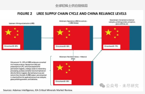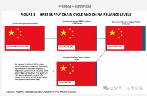 但是,开采是次要的,加工才是关键,而且,并非所有稀土都一样。一旦将焦点从“所有稀土”转向“中重稀土”,中国的地位就从“主导地位”变为“近乎绝对的垄断”。