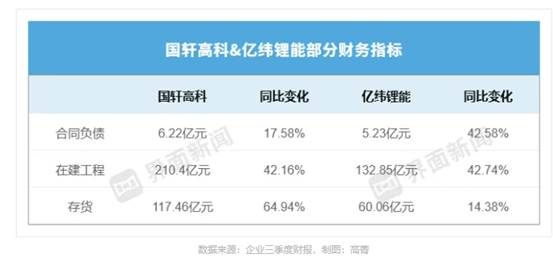 在此背景下,国轩高科和亿纬锂能的合同负债、存货以及在建工程,均呈现不同程度的增长。