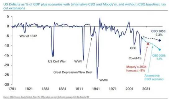 德意志银行特别提到了发达市场主权债务的风险。随着长期收益率接近名义GDP增速,曾经的“债务融资红利期”已经结束。美国持续的巨额赤字水平通常仅见于战争时期,这将对长期财政可持续性构成挑战。