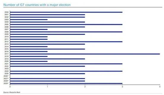 欧洲市场面临截然不同的风险。2026年将是21世纪以来第二次没有安排七国集团(G7)主要成员国选举。这将与过去几年美国、英国和德国都迎来新政府的情况有所不同。