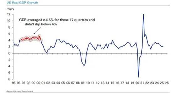 德意志银行指出,1996年至2000年间,美国经济年化增长率曾连续维持在4%以上。尽管本轮周期自2023年以来表现强劲,但平均年化增长率仅为2.6%。