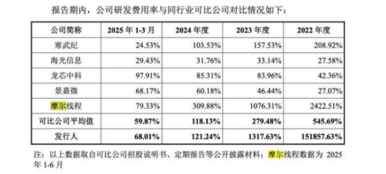 而在费用率方面,招股书数据显示,目前摩尔线程、沐曦股份研发费用率仍基本高于可比公司平均值,反映出公司仍在不断进行研发投入。