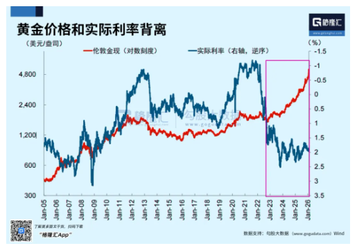 黄金不是生息资产,其传统定价框架的锚一直是实际利率,它是持有黄金的机会成本。理论上来说,金价和实际利率负相关。