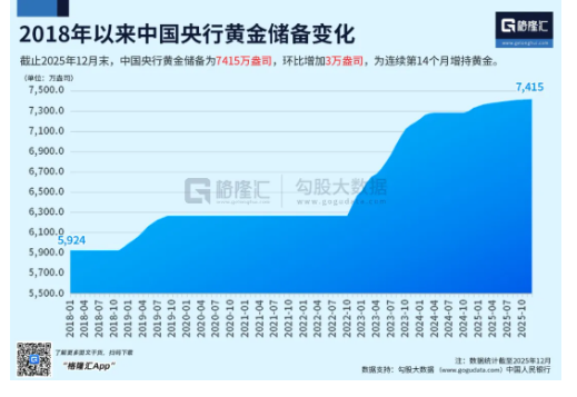 截至2025年12月末,中国央行已经连续14个月增持黄金,黄金储备达到了7415万盎司。