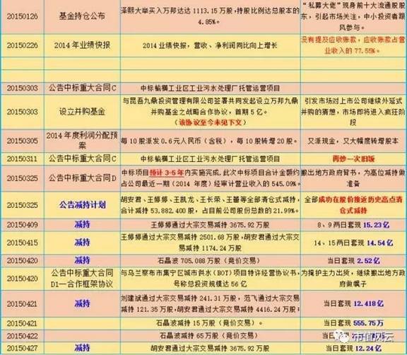 (2)、要实现利用“高送转”等利好在高位派发筹码的目的,就要营造业绩高增长的“市场预期”,在内生式增长乏力的情况下,外延式并购就是最好的方式。上市公司通过并购昊天节能,实现财务并表,公司业绩增长无忧(至少2014年业绩无忧)。在并购方案获得证监会批准,紧接着资产过户,整个时间进度上把握非常紧凑,为的是在三季度实现并表。那么,2014年年报预告上业绩看好了,为下一步发布高送转预案,继续炒高股价做准备。并购重组、业绩预告、高送转预案、重大合同中标、设立并购基金等等都向市场呈现一片欣欣向荣、前景无限的“景象”,给二级投资者无限遐想;