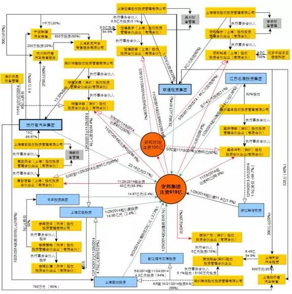 在国际市场上,安邦成为大陆企业出海收购风头最劲的领潮人,先后在欧、美、韩收购、入股了多家保险公司、银行、商业地产,风光无两。2014年,安邦天价购买美国纽约的老牌五星级酒店华尔道夫,瞬时间吸引了所有人的注意力,接下来的两年里,安邦马不停蹄,四处出击,在A股市场连连扫货布局,成为多家上市公司的最大股东,如民生银行(600016.SH)、金融街(000402.SZ)、金地集团(600383.SH)、大商股份(600694.SH)、远洋集团(03377.HK)、华富国际(00952.SZ)等。