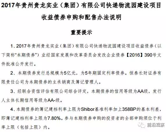 4月27日,一家名叫贵州贵龙的实业公司发行的一笔5年期AA级的企业债利率竟然高达7.8%。募集资金用于搞物流园的建设。