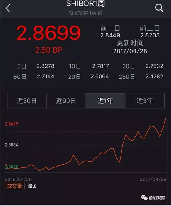 从上图可以看到,SHIBOR一周4月28日的利率为2.8699,再度刷新2年来的新高。