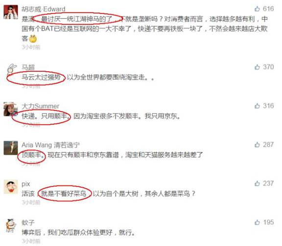 根据虎嗅网文章的留言评论,吃瓜群众们还是多站在顺丰一边。人民群众貌似都不喜欢一统江湖的独霸者,对于“揭竿而起”的更充满敬意。