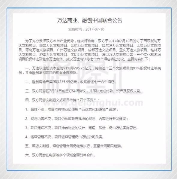 果不其然,10点左右,万达商业和融创中国联合公告:融创以335.95亿元收购万达项目76个酒店,295.75亿元收购万达13个文旅项目的91%股权,融创承担项目贷款,万达保留项目的管理权益。这意味着,除贷款外,融创此次收购支付金额高达631.7亿元,而宣布这个消息的公告只有短短的五百多个字,真正的一字千金。