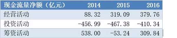 从万达的经营上看,公司保持稳健的经营现金流入,但是万达广场和万达城这些项目都要烧钱,现金流压力也在增大,还是得靠融资。根据披露的数据显示,万达2014-2016 年间:经营活动现金流净额稳定增长,但是投资性现金流净额却一直维持高位,基本都是在靠融资输血。