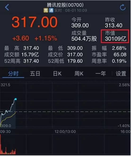 2017年8月1日,腾讯控股总股本94.98亿股,股价达到315.86元,就突破3万亿元。