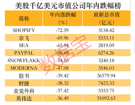整体来看,今年有近八成美股股价出现下跌,一批市值超千亿美元的个股平均跌幅达近14%,20多只个股跌超30%。其中,SHOPIFY跌近73%居首,直接从去年的万亿人民币市值跌到3000多亿市值。