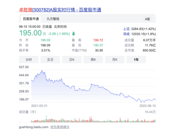 自2019年6月18日上市至2021年上半年,公司股价一路飙涨。卓胜微上市初每股发行价35.29元,股价在2021年6月30日达到544.68元/股的顶峰,涨幅达1443.44%,市值直逼行业国际老大,但当下股价却仅有195元,下跌已不是仅仅用腰斩来形容。