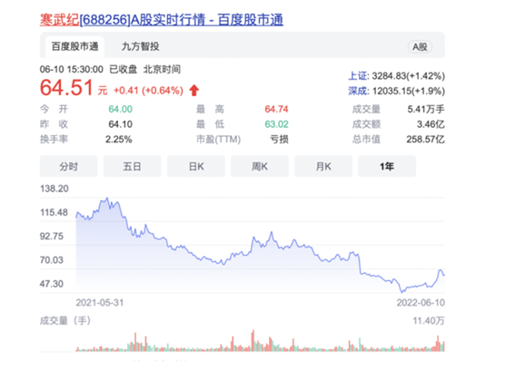 还有曾经众星拱月般的“芯片独角兽”寒武纪,上市时光环笼罩、明星资本加持,上市首日的股价涨幅一度超过300%,市值突破千亿。但就在这短短的一年多的时间,寒武纪的股价却坐了过山车一般急转直下,如今股价跌到了64.5元、市值258.6元,与1194亿元巅峰市值相比,已蒸发近80%。