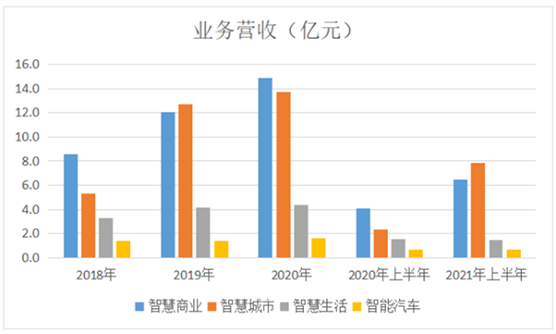 于2021年上半年,两者分别占营收约39.2%和47.6%,而智慧城市的增长较快,过往3年收入CAGR达到61%,高于智慧商业的32%。