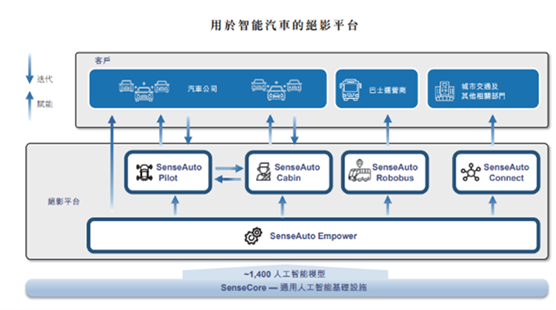 智能汽车由五个产品组成,即SenseAuto Pilot(ADAS产品)、SenseAuto Cabin(包括驾驶员分析系统(DMS)、乘客分析系统(OMS)及智能车载娱乐(IVI)系统)、SenseAuto Empower(AI-as-a-Service产品,支持车企内部的AI开发计划)、SenseAuto Robobus(L4级的自动驾驶产品,提供无人巴士)及SenseAuto Connect(车路协同产品)。