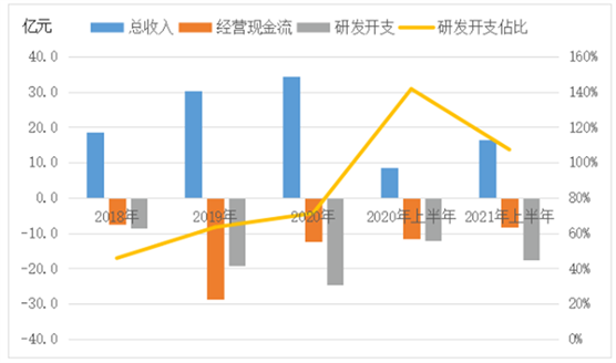 商汤目前经营现金流仍然是负数,除了付款周期长外,持续加大研发支出亦是主要原因。过去三年半,研发开支分别占营收的45.9%、63.3%、71.3%、107.3%。