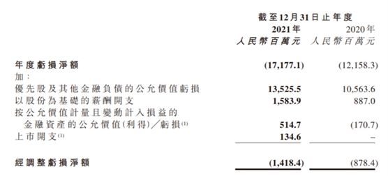 但公司一直亏损,2018年、2019年、2020年及2021年,商汤科技分别亏损人民币34.33亿元、49.68亿元、121.58亿元、171.7亿元。