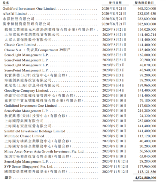 结合各轮融资数据,D轮投资方包括商汤科技Sensetime、软银中国,东方明珠旗下产业投资基金、PAC、前海梧桐并购基金、朗盛资本等。其持有优先股数为4,524,880,000,共计融资16.00亿美元(大约125.28亿港元),目前其持有者或已亏损总计1.52亿美元(大约11.9亿港元)。