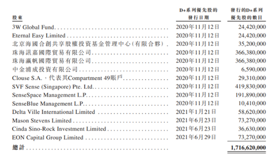 D+轮投资者包括包括软银中国、中金浦成、3W Partners、信达汉石投资(Cinda Sino-Rock)以及商汤创始人汤晓鸥(SenseSpace和SenseSpaceBlue)、Clouse S.A、SVF Sense、Delta Ville、Mason Stevens、EON Capital,其持有优先股数为1,716,620,000,共计融资7.03亿美元(大约55.04亿港元),目前其持有者或已亏损总计1.53亿美元(大约11.98亿港元)。