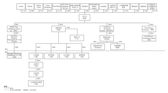 商汤科技上市前,占股权26.43%和投票权70.22%的汤教授与持有公司21.37%股份的Amind将在上市后同为控股股东;其他股东,Sense (Singapore) Pte. Ltd持有14.88%,SenseTalent持有12.17%,SVF淘宝中国持有7.59%。股权结构如下: