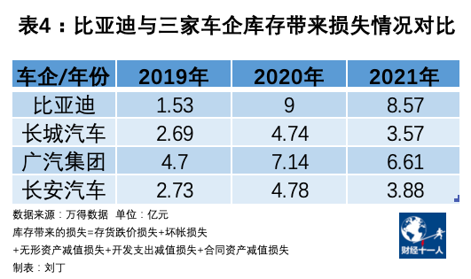 从2019年到2021年,比亚迪积累了10.9万辆库存车,由此带来的存货跌价准备等损耗,也拉低了比亚迪利润率。