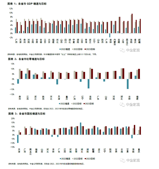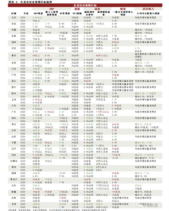 省级地方政府的2023年经济增速目标较2022年目标略有下调,但并不代表政策力度大幅减弱。省级地方政府公布的2023年GDP增速目标均值为6.1%,较2022年目标6.5%略有下调。从分布来看,21个地区2023年GDP增速目标低于2022年目标,另有6个地区持平,仅有4个地区上调增速目标。有7个地区在设定增速目标时使用“以上”措辞,低于2022年的10个。我们认为,在2022年经济遭遇疫情影响的背景下,各地实际GDP增速普遍低于2022年初目标,因此地方政府下调2023年经济增速目标并不代表政策力度大幅减弱。可以印证的是,部分地区在下调GDP目标的同时也指出“在实际工作中力争更高增长”。