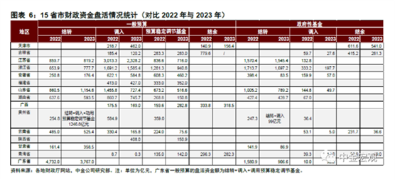 地方发布的2023年预算草案呈以下四大特征:一是收入端各地加强全口径财政资源统筹衔接,表现在“四本账”统筹、加大“三资”(资金、资产、资源)盘活力度以保障地方财力;二是支出结构上有保有压,重点保障地方“三保”、债务还本付息、国家和地方重大战略任务等,多省份发布的本级三公经费预算数据显示,今年将继续压降并为实现重大发展战略腾挪资金;三是在支出层级方面全方面下沉财力,多省推进省以下财政体制改革,通过加大中央和本级转移支付以保障基层运转;四是在隐性债务化解方面,地方政府的态度仍较为坚决。此外,2022年底金融机构财政存款余额仍相对较高,我们认为或因疫情等因素导致部分资金支出不畅,随着今年疫情形势缓解,资金沉淀情况将明显改善。我们统计的数据显示,苏浙鲁粤等经济大省可盘活的资金量并未较去年显著降低,仍存在一定的挖潜空间,这也将对今年的财政支出“加力”提供资金支持。